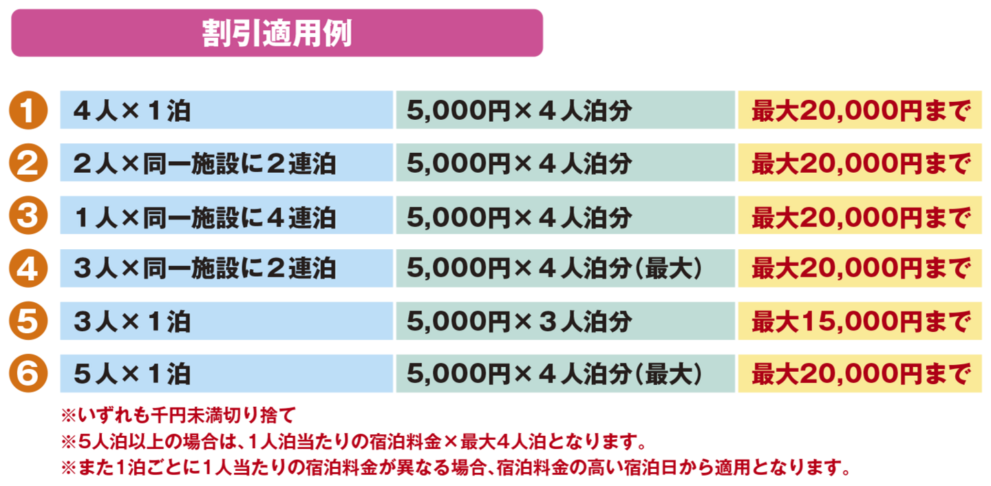 キャッシュバック又は割引額は、他割引適用後の自己負担総額(千円未満切り捨て)を上限に宿泊人数×一人当たり1泊上限5,000円(最大20,000円)です。